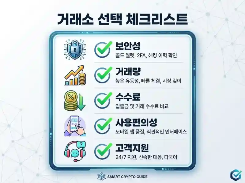 가상자산 거래소 선택 시 수수료보다 중요한 6가지 기준! 보안성·유동성·규제 준수·고객 지원까지 실사용자 후기 분석. 업비트·빗썸·코인원 비교, 콜드월렛 보관율·ISMS 인증 체크로 안전한 투자 시작하세요