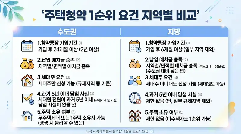 민영주택은 비규제지역에서 세대원도 1순위 청약이 가능합니다. 하지만 투기과열지구나 청약과열지역에서는 반드시 세대주여야 1순위 자격이 주어집니다. 국민주택 역시 세대주 요건이 적용되는 경우가 많으므로 공고문을 반드시 확인하세요.