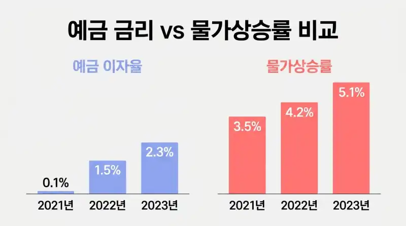 얼핏 보면 예금 금리가 물가 상승률보다 높으니 괜찮아 보이잖아요? 여기서 많은 분들이 간과하는 게 있어요. 이자소득세 15.4%를 빼면 실수령 금리는 대략 연 2.37% 정도가 됩니다. 물가 상승률 2.1%를 빼면? 실질 수익률은 고작 0.27%예요.