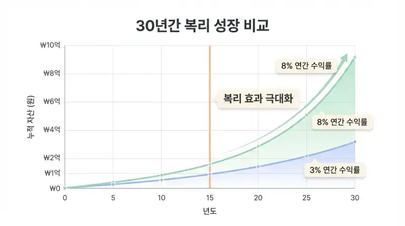 10년 차에는 약 4,300만 원 차이였던 게, 20년이 되니 2억 6,000만 원, 30년이 되면 무려 9억 원 넘게 벌어져요. 이게 바로 복리의 힘이에요. 초반에는 별 차이 없어 보이다가 후반에 폭발적으로 격차가 확대되는 구조거든요.